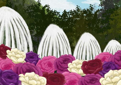 わが国の庭園・公園は、花鳥風月を愛する国民性も相俟って、築山、池、流れなどを配して、できるだけ自然に近い景観を生み出すように作られてきました。一方、洋風庭園は幾何学的な構成に加えて、人工的な彫像、噴水などを配置する特徴を持ちます。明治時代に洋館が建築されるようになり、これとともに西洋庭園も導入され、フランス式庭園、イギリス式庭園、さらに日本庭園との折衷式庭園なども作られています。神戸市月見山にはその西洋式庭園があります。もとは皇室の別荘で、太平洋戦争で焼失した旧武庫離宮(須磨離宮)を譲り受け、1967年に都市公園として整備されました。当時皇太子だった上皇と美智子様のご成婚記念事業のひとつでした。大阪湾を一望する開放的な庭園で、整然と並んだ噴水がリズミックに高さを変えて水を噴き上げ、周囲を四季折々に美しい花が色を添えます。なんといっても見ものはバラ園で、初夏には約180種4000株がいっせいに花をつけ、競い合って咲き誇ります。しかも2番花、三番花と四季咲きのバラを、春、夏、秋と何度も楽しむことができます。晩秋にも紅葉とバラの絶妙のコンビネーションを愛でられます。夜には噴水もライトアップされ、幻想的なスペースに変化します。近年は紅葉のシーズンにイルミネーションのイベントも開催されるようです。